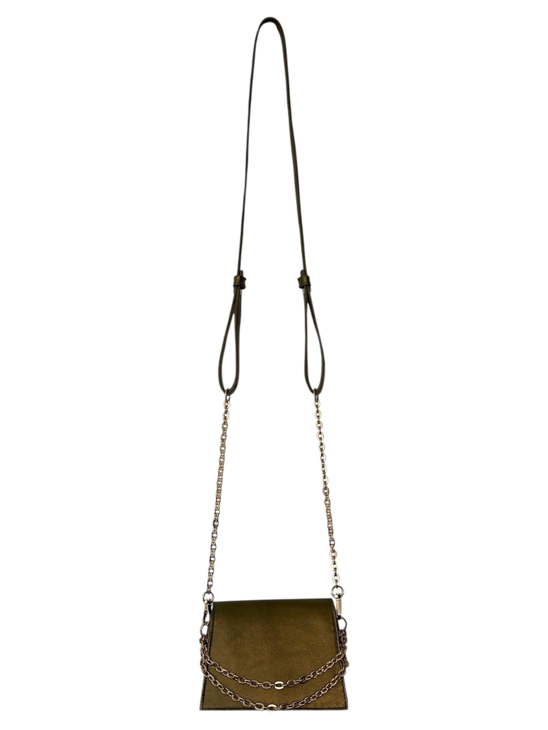 Esta mini cartera, elaborada al 100% en cuero y a mano , combina un diseño impecable con una estética atemporal que realza cualquier look. Su cadena dorada aporta un toque de fuerza y sofisticación, mientras que su strap eleva la pieza con un carácter exclusivo.