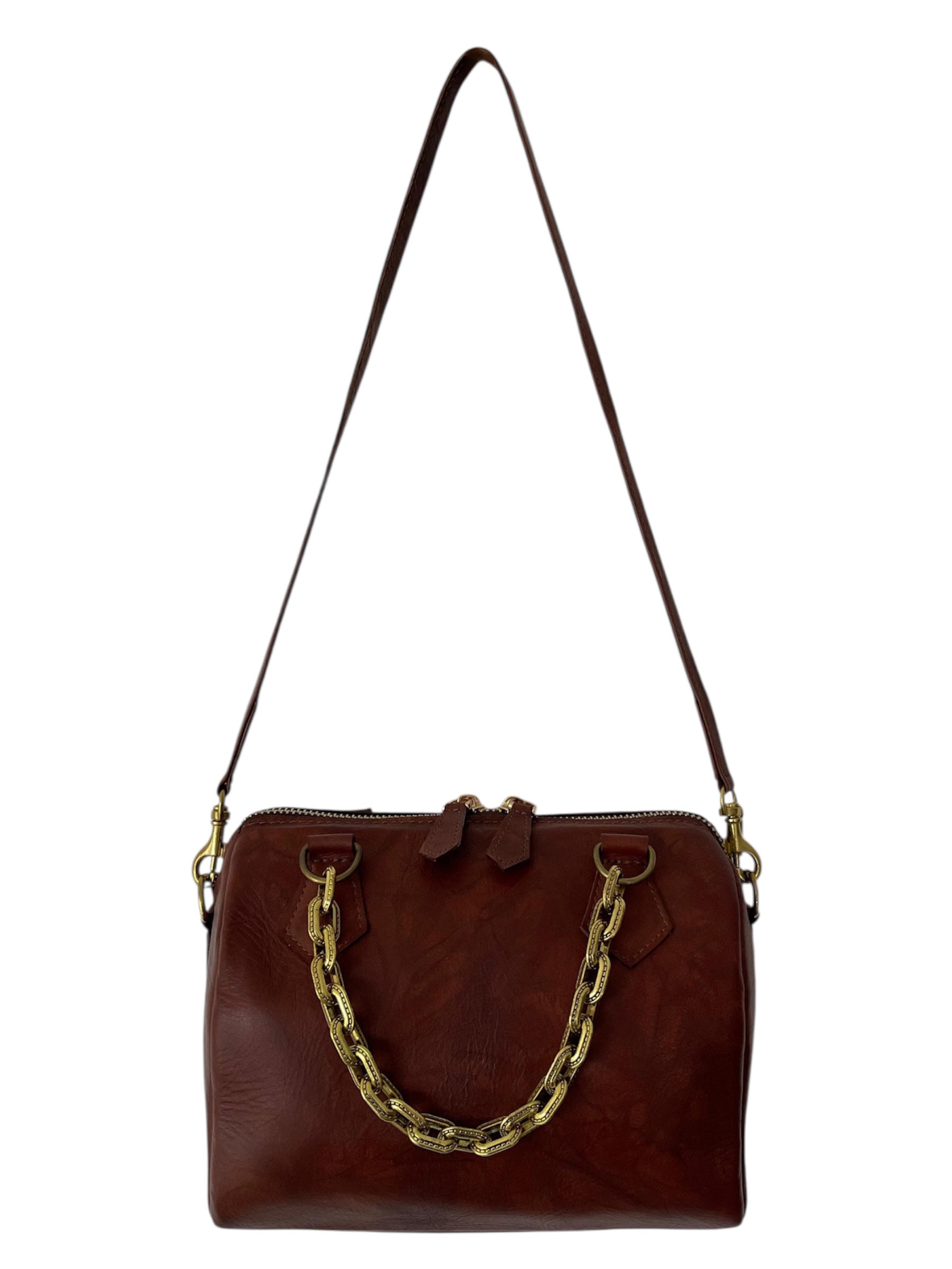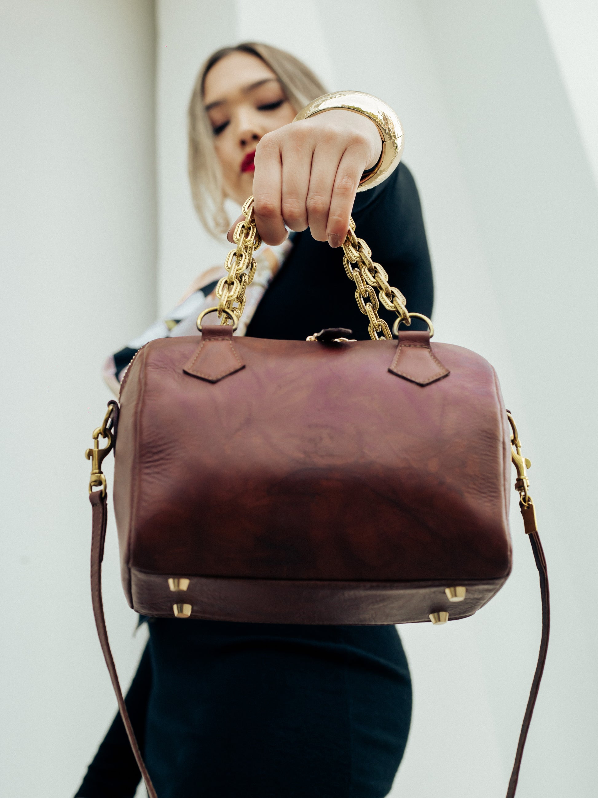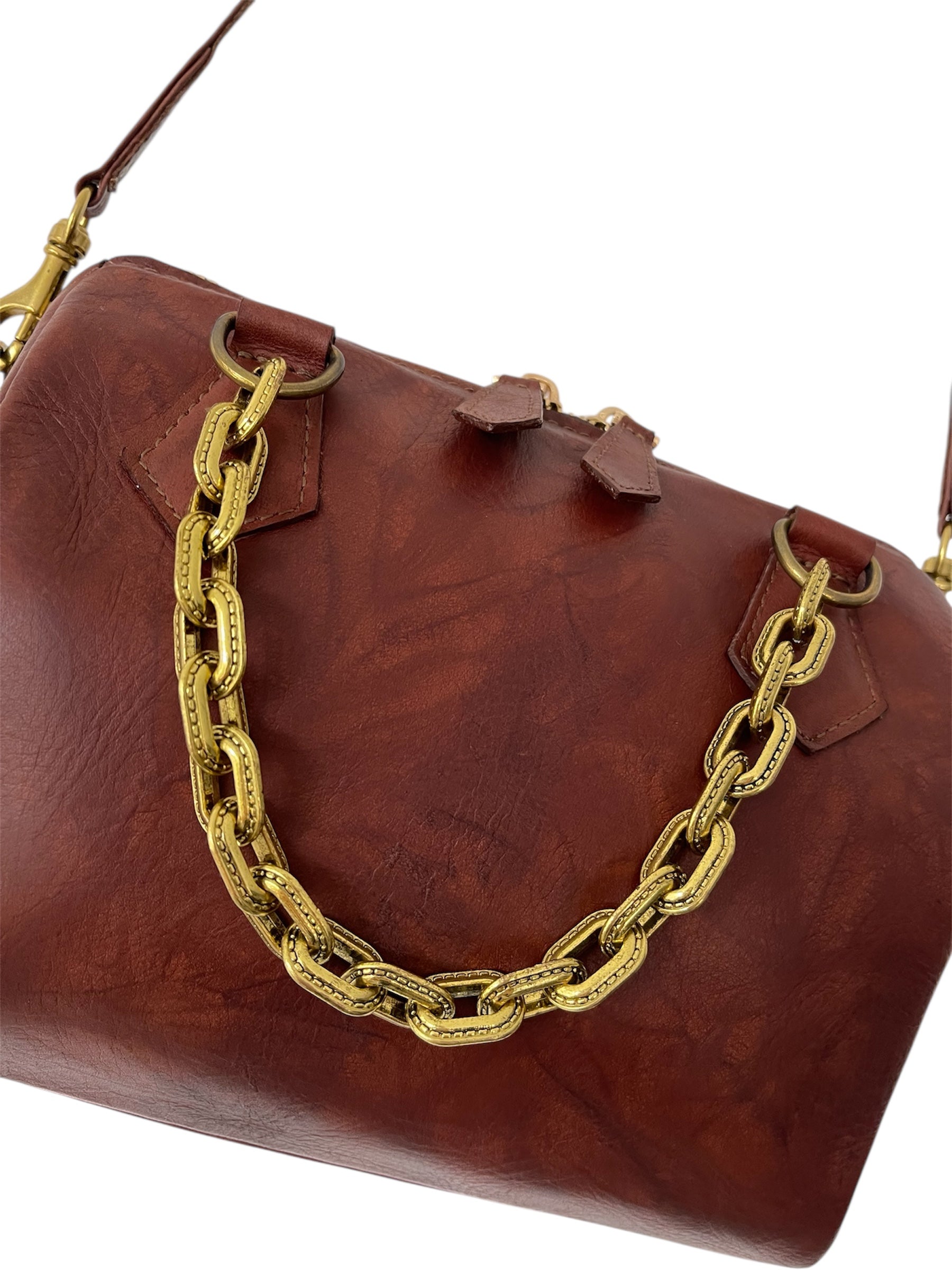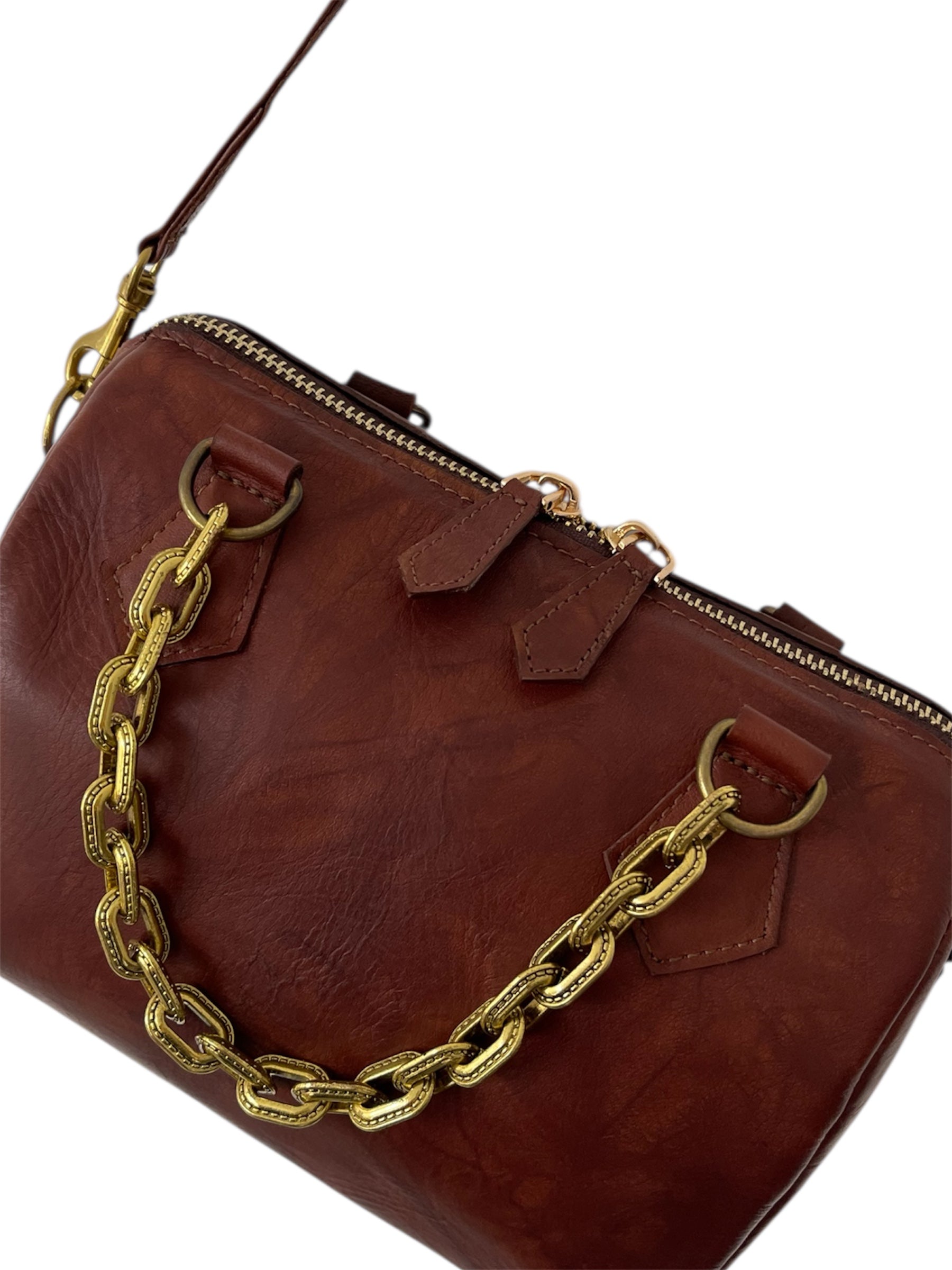 Sus asas de cadena aportan un brillo sutil pero contundente, convirtiéndola en un statement moderno que eleva cualquier look. Su silueta firme y su presencia refinada la vuelven una pieza única: versátil, poderosa y absolutamente inolvidable.