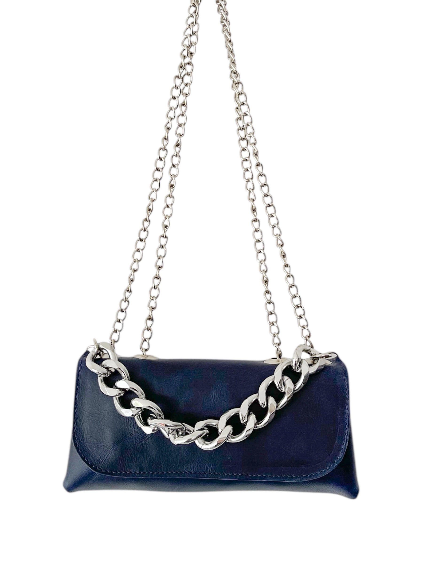 Su strap de cadena ajustable permite llevarla con naturalidad al medio hombro o cruzada para un estilo más urbano y dinámico. A esto se suma una cadena gruesa de impacto, pensada para lucirla sostenida de la mano como un statement absoluto.